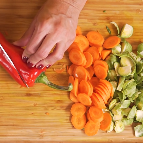 Közben megtisztítjuk és felaprítjuk a zöldségeket.
