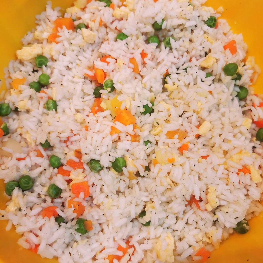 Ezután adjuk hozzá a főtt rizst a serpenyőhöz, szórjuk meg sóval és borssal, majd keverjük össze.