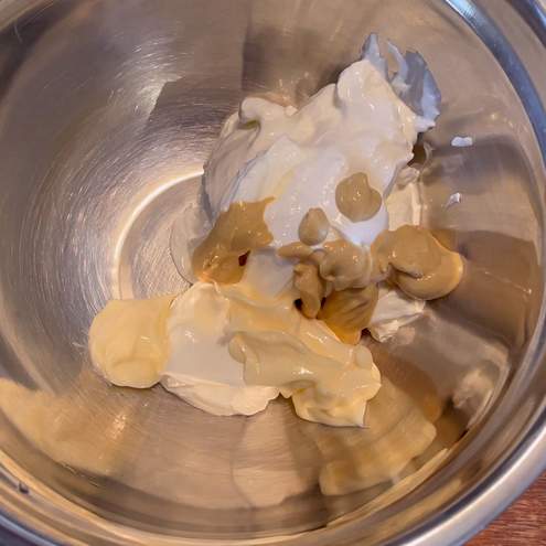 Fokozatosan hozzáadjuk a tálba a savanyú tejszínt, a mustárt és a majonézt.